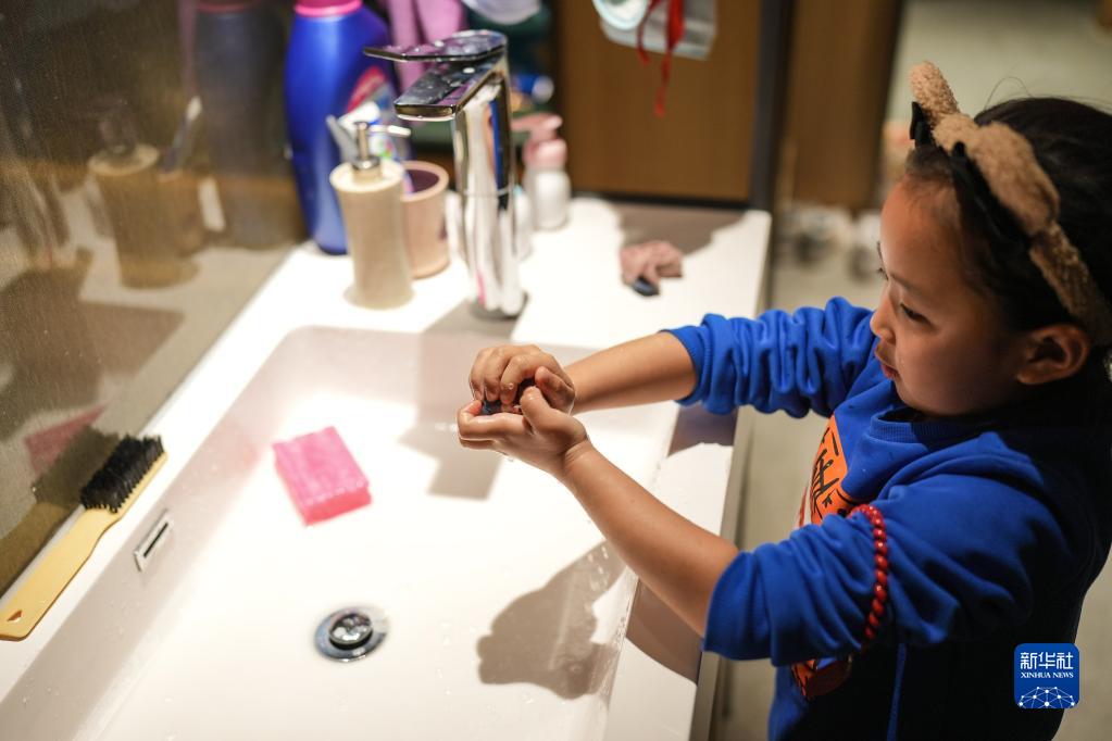 在酒店房间,马兰花儿童合唱团的韩舒心自己洗袜子(1月10日摄)。新华社记者 彭子洋 摄