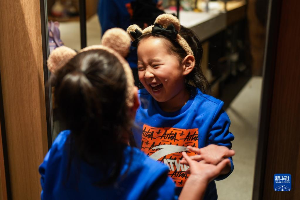 在酒店房间,马兰花儿童合唱团的韩舒心对着镜子练习笑容(1月10日摄)。新华社记者 彭子洋 摄