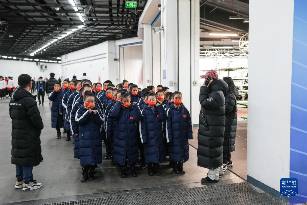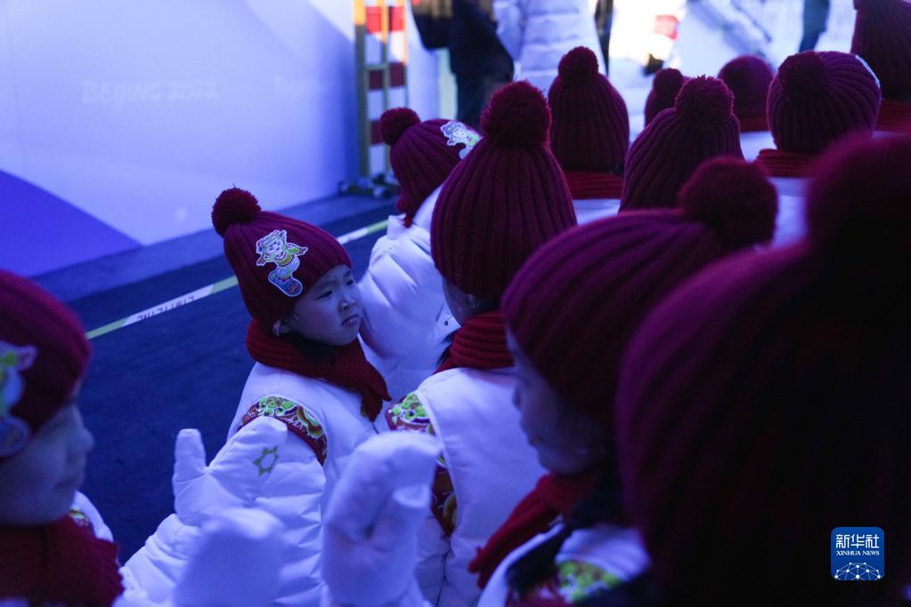 彩排前,在国家体育场(鸟巢),马兰花儿童合唱团的孩子们准备上场(1月27日摄)。新华社记者 彭子洋 摄