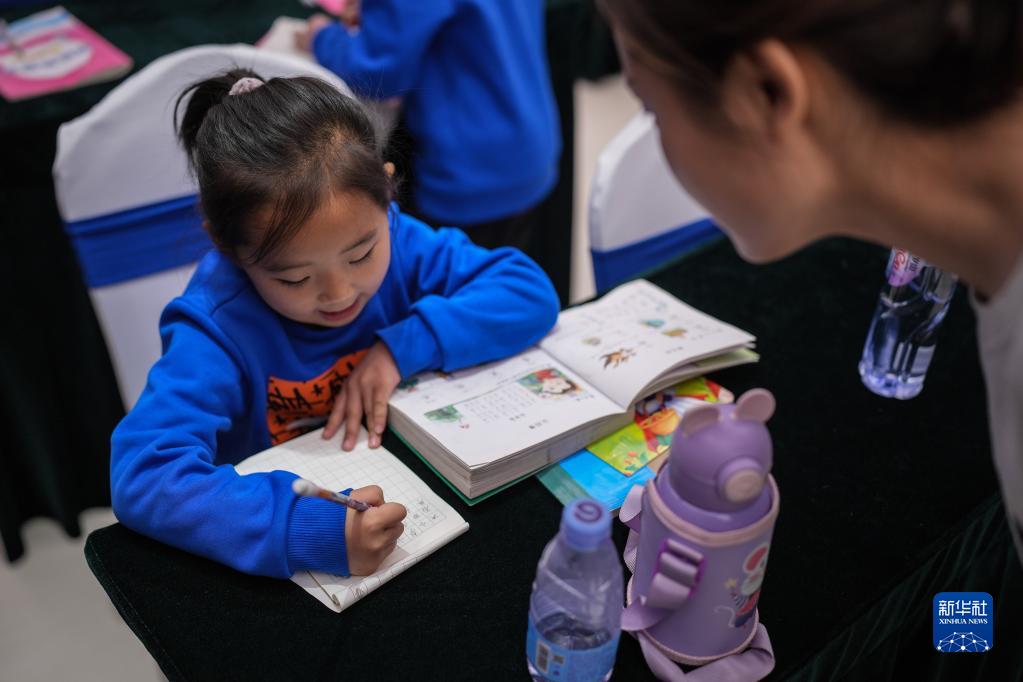 在酒店会议室,老师辅导马兰花儿童合唱团的韩舒心写作业(1月11日摄)。新华社记者 彭子洋 摄