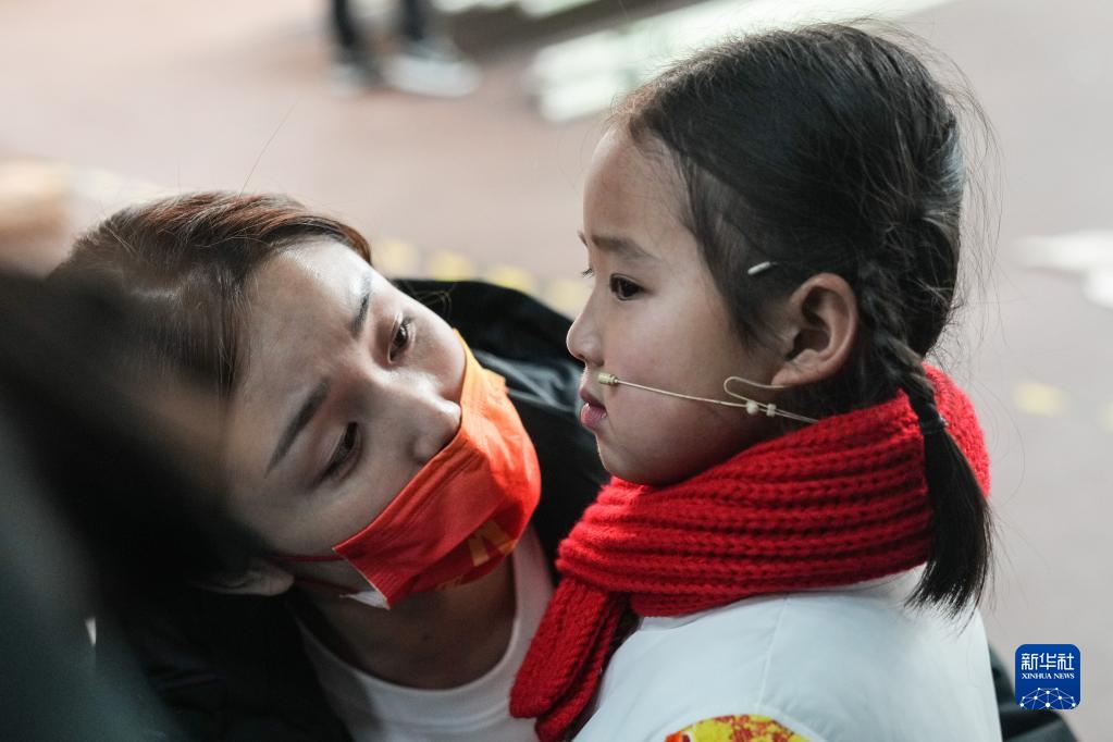 在国家体育场(鸟巢)后台,老师安慰因过敏无法上场彩排的韩舒心(右)(1月27日摄)。新华社记者 彭子洋 摄