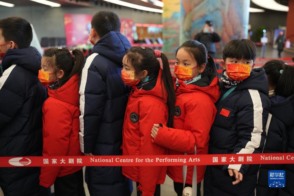 马兰花儿童合唱团的孩子们排队进入国家大剧院录音(1月17日摄)。新华社记者 彭子洋 摄