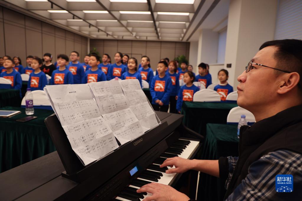 保定学院音乐舞蹈学院声乐教师王金山(右)与马兰花儿童合唱团在酒店会议室排练(1月11日摄)。新华社记者 许雅楠 摄