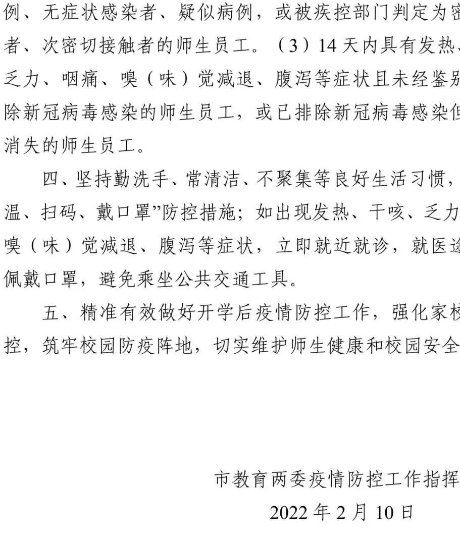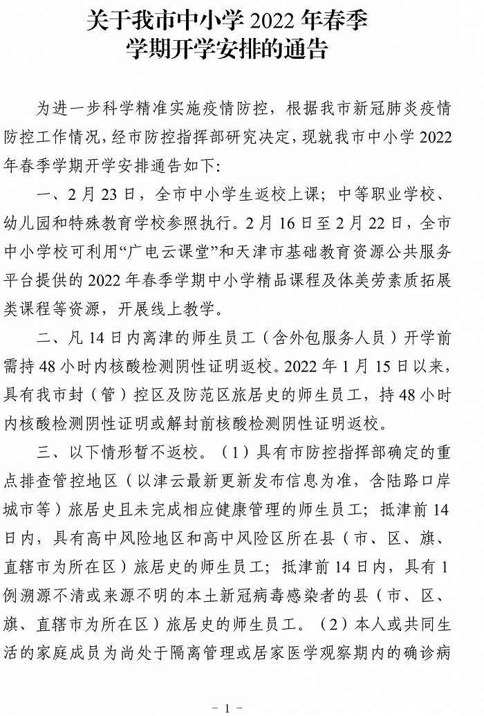 据“天津发布”公众号消息,2月10日,“津门教育”微信公众号发布关于天津市中小学2022年春季学期开学安排的通告,2月23日,全市中小学生返校上课。