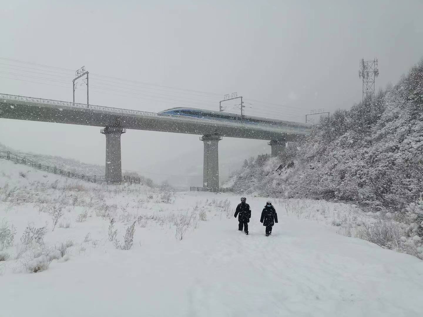 皑皑飞雪,茫茫原野,厚雪没过了他们的脚踝。走到高架桥附近,他远远看见“瑞雪迎春”号在风雪中呼啸而过。他们此时在雪地中已步巡了近两个小时。