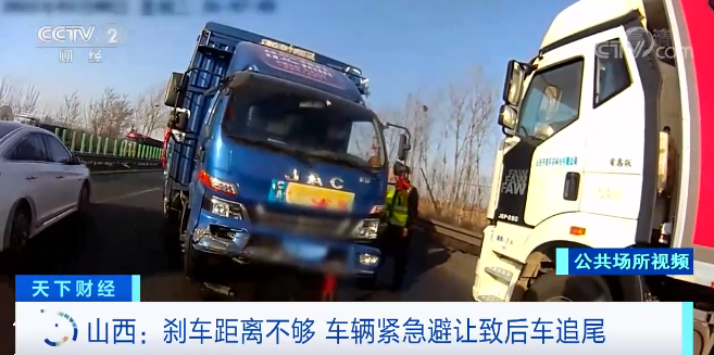 近日,京昆高速山西祁县段发生了一起事故。画面中,这辆蓝色小车行至事发地点时,由于前方两辆轿车突然减速,在刹车距离不够的情况下,驾驶人只好向右紧急变道避让,可紧随其后的一辆白色面包车却没能来得及反应,追尾了蓝色小车。