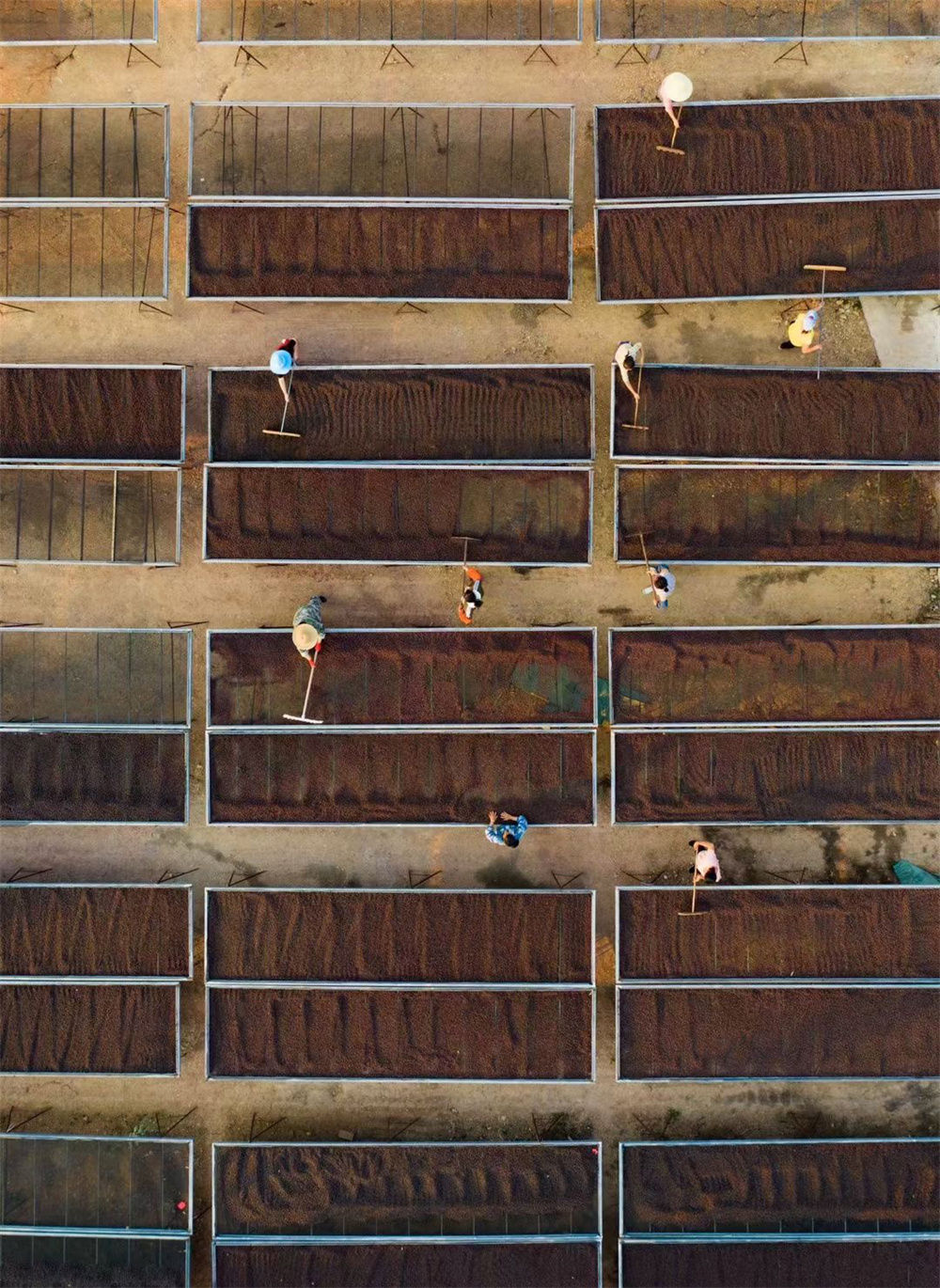 这是云南普洱市思茅区一家企业的咖啡晒场,工作人员在翻晒咖啡(资料图片)。新华社发