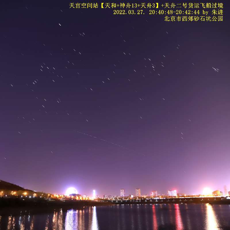 3月27日,中国空间站组合体、天舟二号货运飞船飞越北京上空。(李永刚 摄)