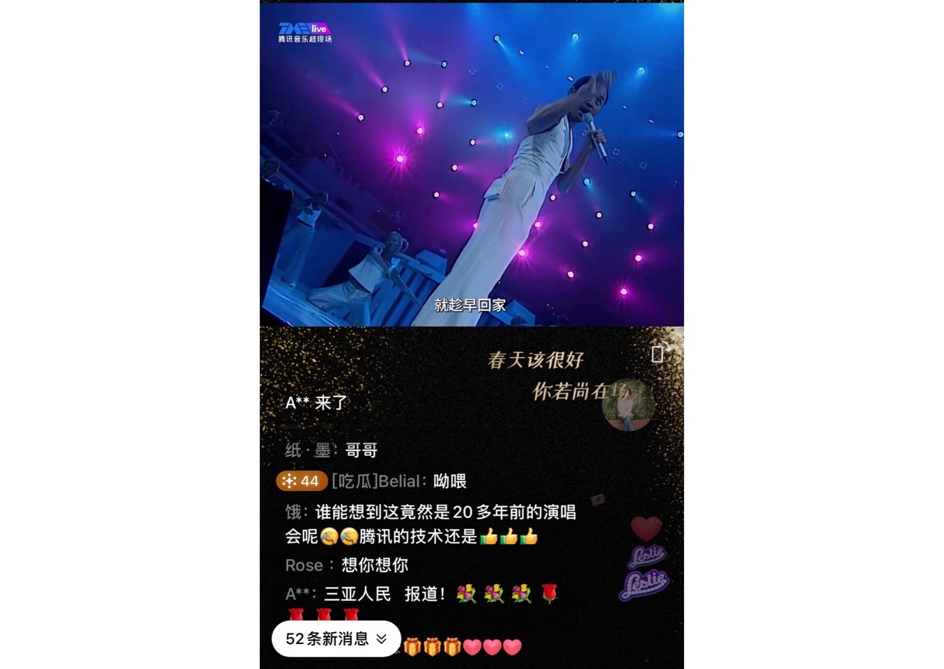 “留住这世上最暖一面,茫茫人海取暖渡过最冷一天……”当晚演唱会直播间里,不少歌迷将张国荣经典歌词打在公屏,以表达对张国荣及其经典作品的怀念。