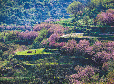 春日,村民在山花烂漫的覆卮山中耕作。覆卮山地处浙江省绍兴市上虞区、嵊州市和宁波市余姚市的交界地带,东澄村就位于覆卮山之巅,在这里俯视四周,群山连绵,云雾缭绕,美丽壮观。