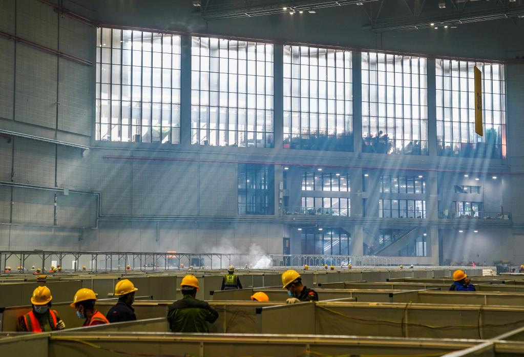 4月7日,工人在国家会展中心(上海)内作业。(中建三局供图)