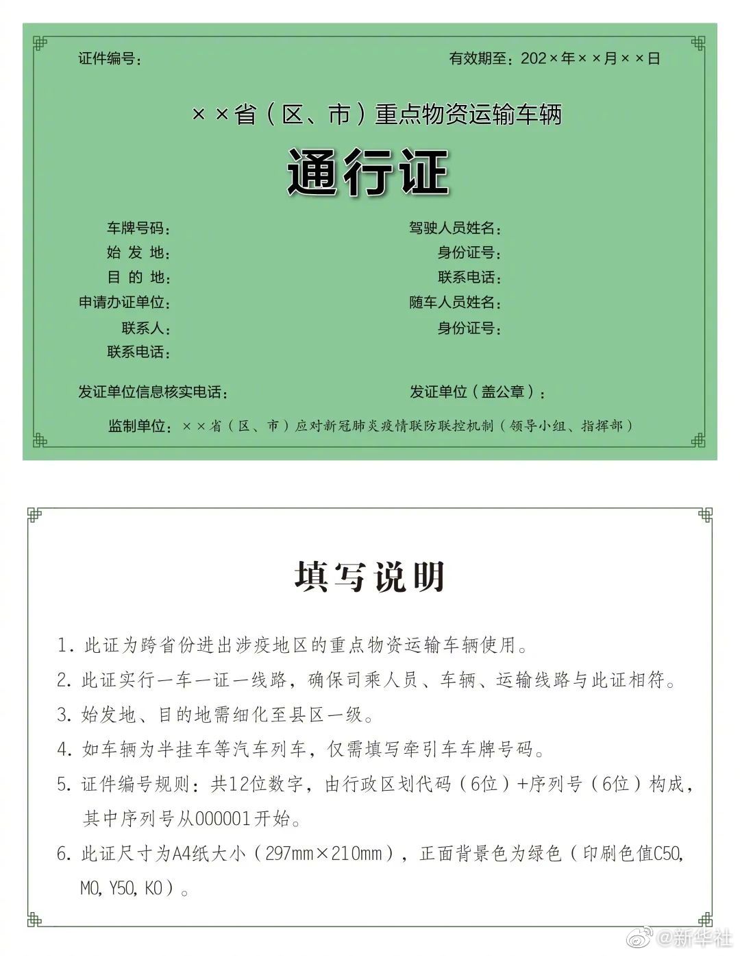 记者14日从国务院联防联控机制综合组交通管控与运输保障专班了解到,交通管控与运输保障专班印发通知,公布了《重点物资运输车辆通行证》式样,推动建立统一规范的通行证制度,保障涉疫地区重点物资运输。通行证实行“一车一证一线路”,有效期由各省级联防联控机制确定,纸质和电子通行证具有同等效力。对于持有通行证的跨省进出涉疫地区的货运车辆要保障优先通行,有条件的地区设立专用通道保障持通行证车辆快速通行。(记者叶昊鸣)