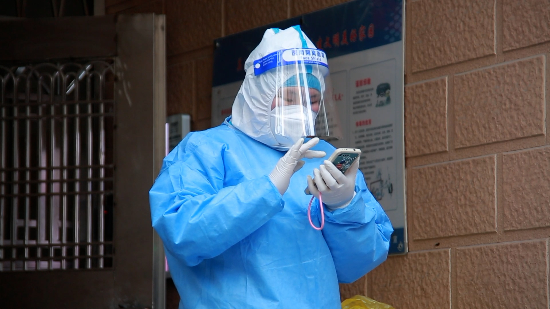 因为楼栋里出现了阳性感染者,从4月1号开始,小区居委会主任陈蕴琛就跟着这幢楼200多居民一起被封闭在楼里。她每天“全副武装”,一次又一次往返于各楼层,一遍又一遍敲开居民的房门,在手机上回复大家的每一个疑问。