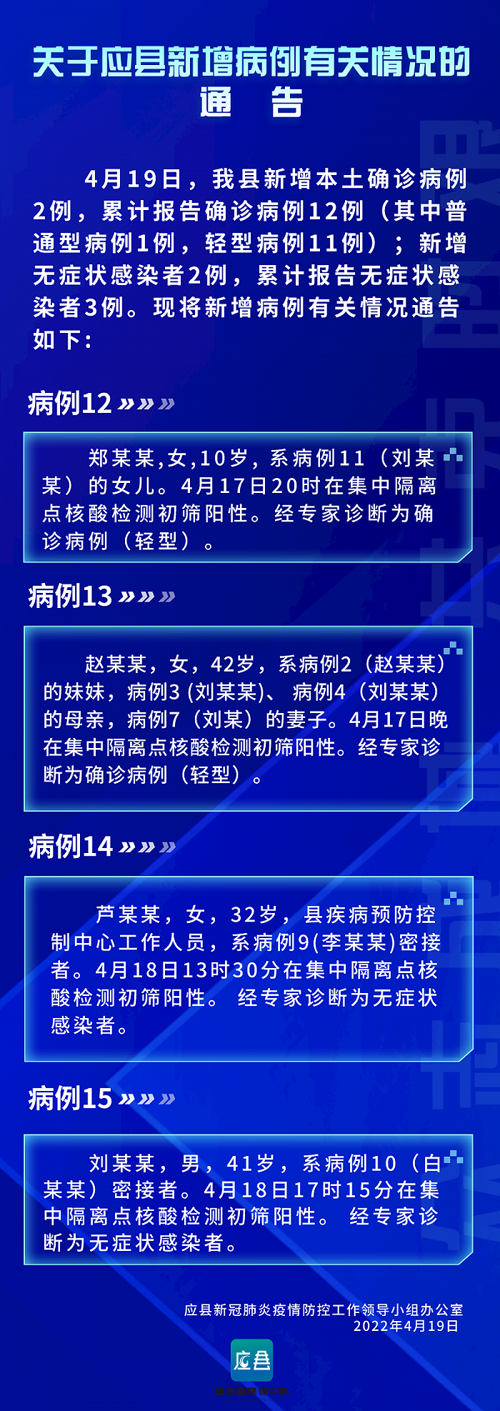 据“这里是朔州”微信公众号消息,4月19日,应县新增本土确诊病例2例,累计报告确诊病例12例(其中普通型病例1例,轻型病例11例);新增无症状感染者2例,累计报告无症状感染者3例。