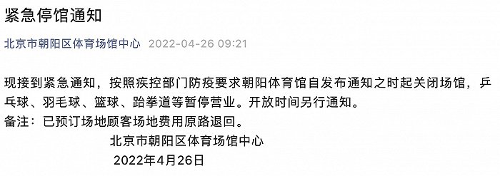 “北京市朝阳区体育场馆中心”微信公众号26日发布紧急停馆通知称,现接到紧急通知,按照疾控部门防疫要求朝阳体育馆自发布通知之时起关闭场馆,乒乓球、羽毛球、篮球、跆拳道等暂停营业。开放时间另行通知。