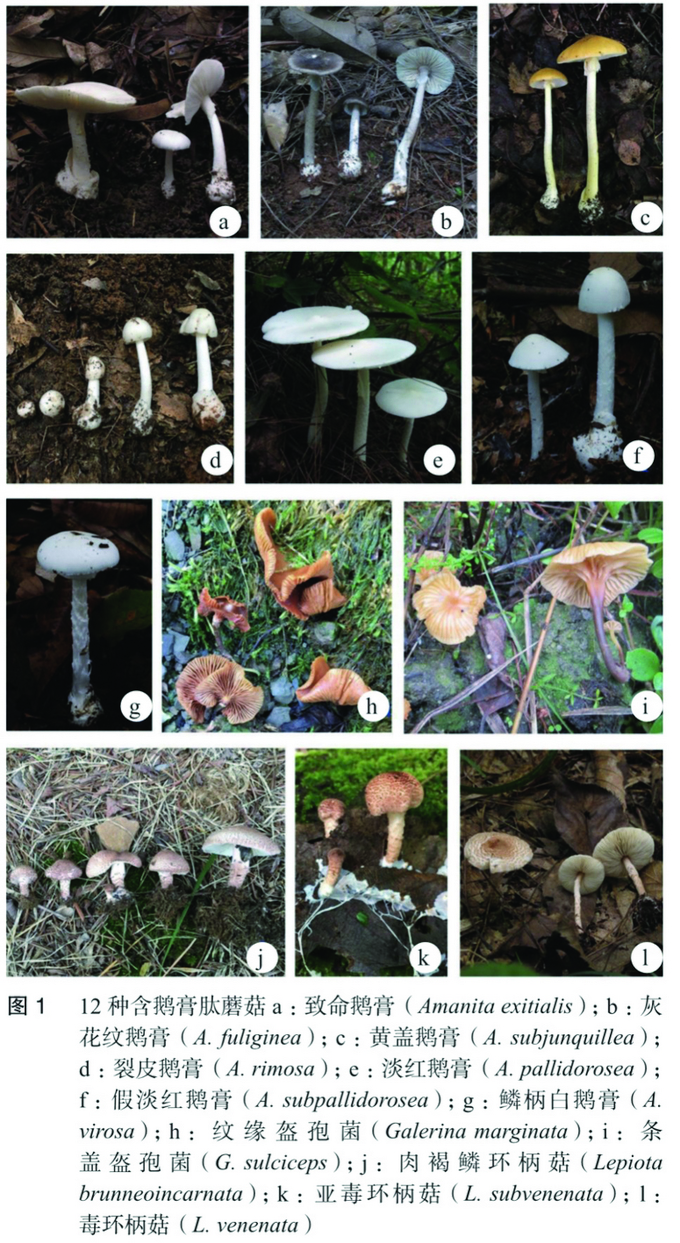 12种含鹅膏肽蘑菇:a.致命鹅膏;b.灰花纹鹅膏;c.黄盖鹅膏;d.裂皮鹅膏;e.淡红鹅膏;f.假淡红鹅膏;g.鳞柄白鹅膏;h.纹缘盔孢菌;i.条盖灰孢菌;j.肉褐鳞环柄菇;k.亚毒环柄菇;l.毒环柄菇