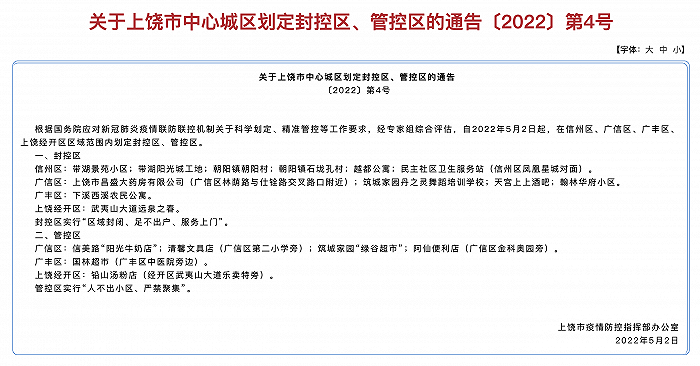 江西省上饶市政府网5月2日发布关于上饶市中心城区划定封控区、管控区的通告,根据国务院应对新冠肺炎疫情联防联控机制关于科学划定、精准管控等工作要求,经专家组综合评估,自2022年5月2日起,在信州区、广信区、广丰区、上饶经开区区域范围内划定封控区、管控区。