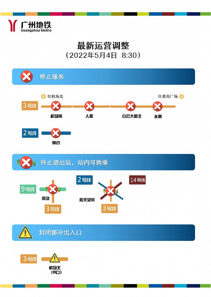 据@广州地铁 微博消息,接政府部门通知,因疫情防控需要,自5月4日8:30起,三号线永泰站停止对外服务,二、三及十四号线嘉禾望岗站停止进出站服务,仅保留站内换乘功能。