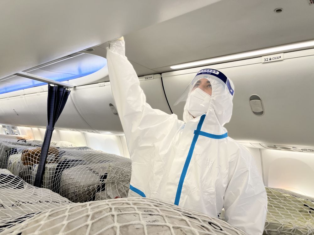 艾斯卡尔·艾沙在国际“客改货”包机航班上工作。 新华社发 (车捷 摄)