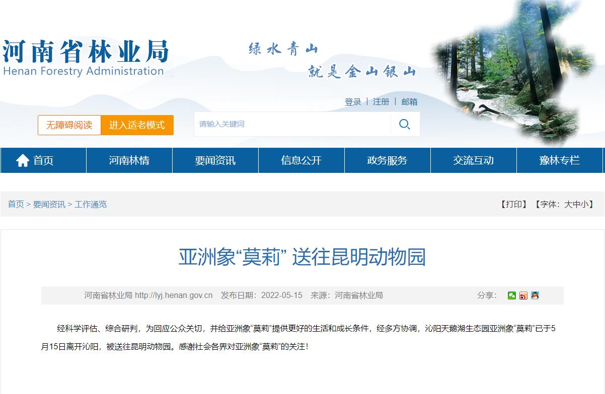 据河南省林业局网站5月15日消息,经科学评估、综合研判,为回应公众关切,并给亚洲象“莫莉”提供更好的生活和成长条件,经多方协调,沁阳天鹅湖生态园亚洲象“莫莉”已于5月15日离开沁阳,被送往昆明动物园。感谢社会各界对亚洲象“莫莉”的关注!