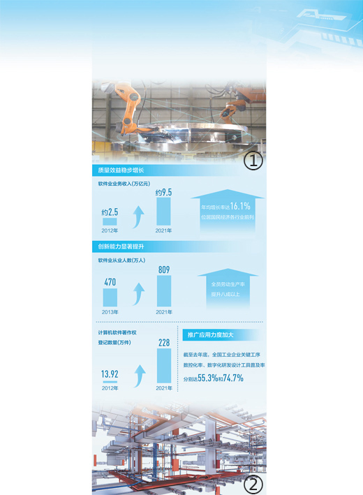 “10年来,我国软件产业实现规模质量效益全面提升,驱动数字经济蓬勃发展。”中国软件工业协会秘书长吕卫锋说。