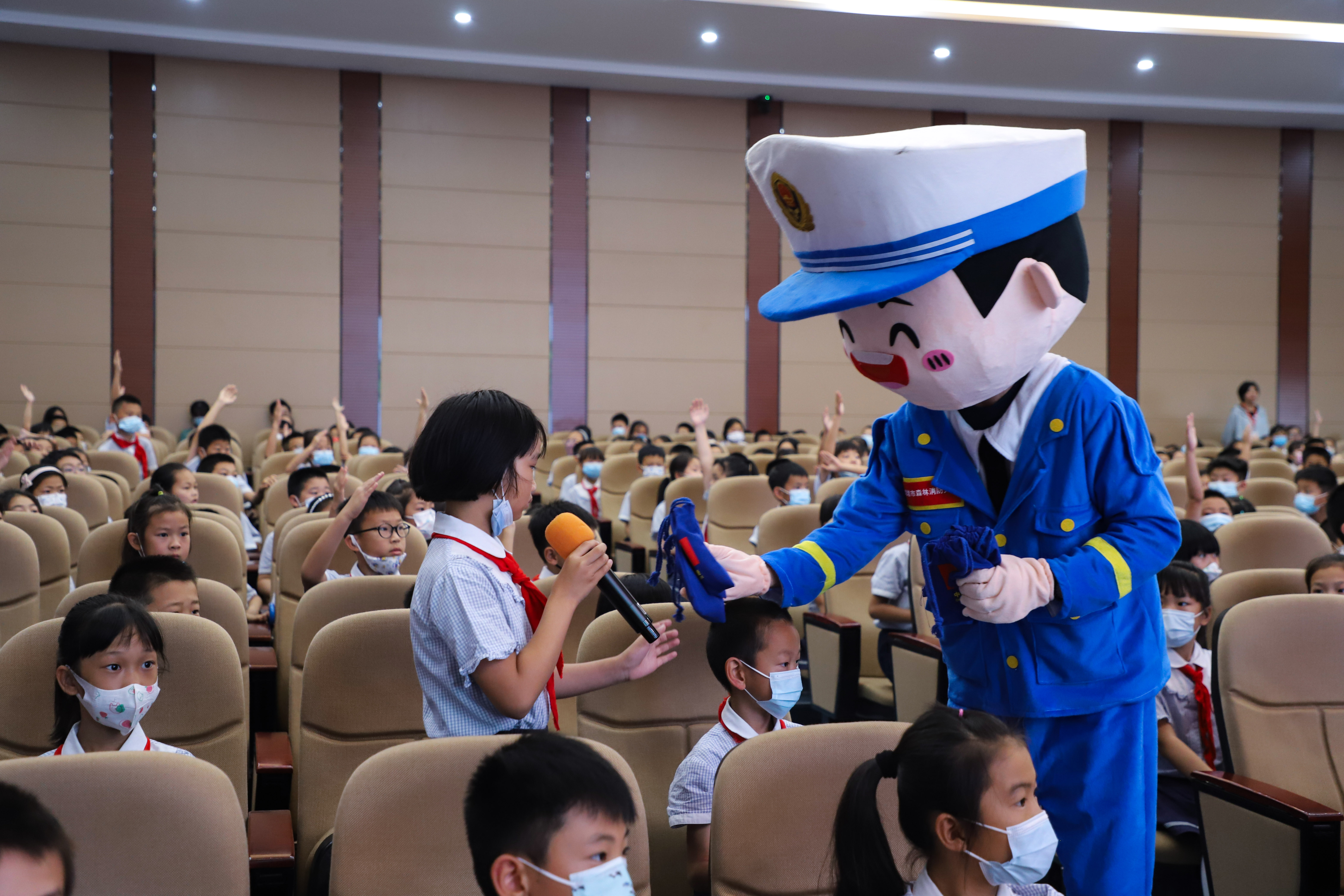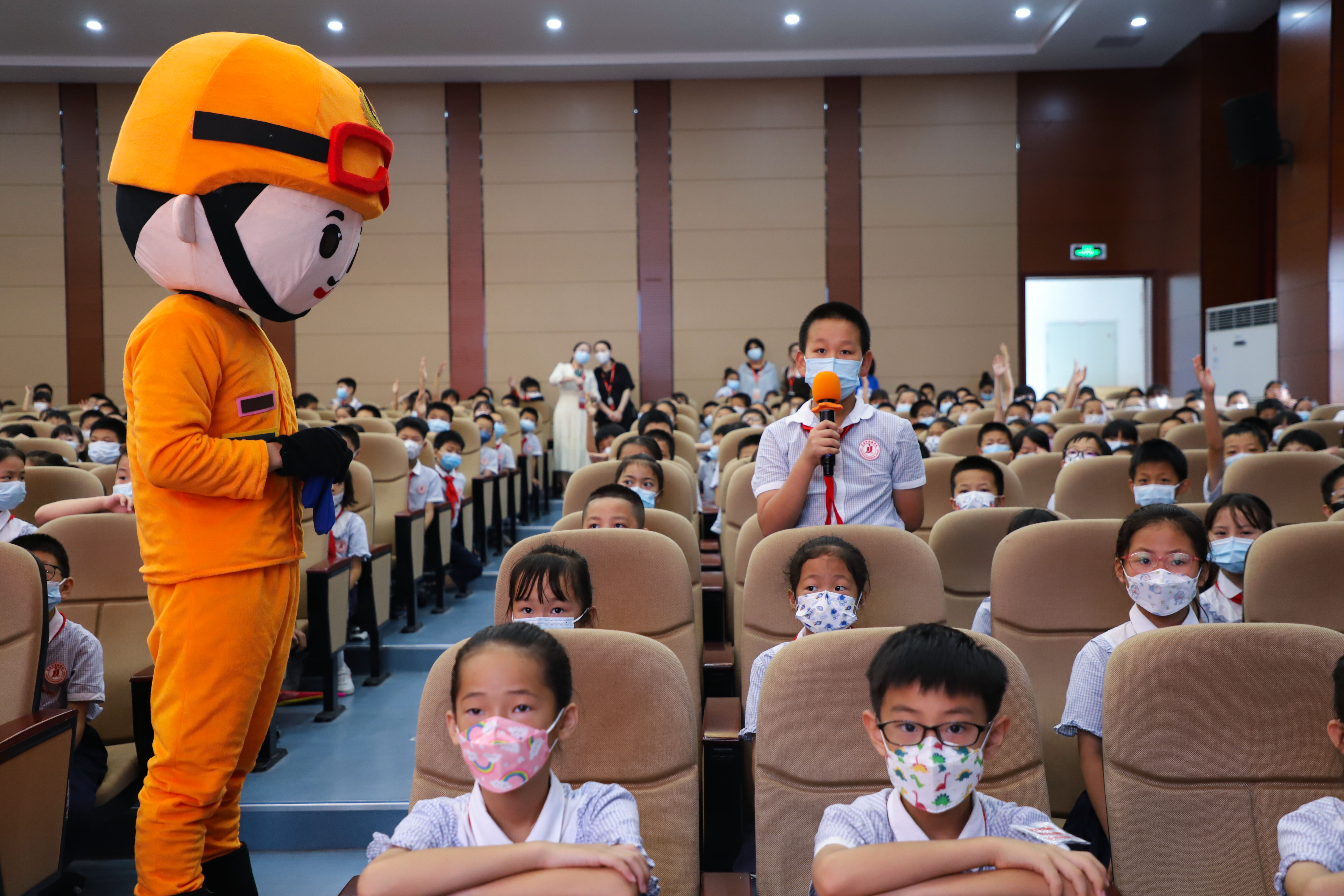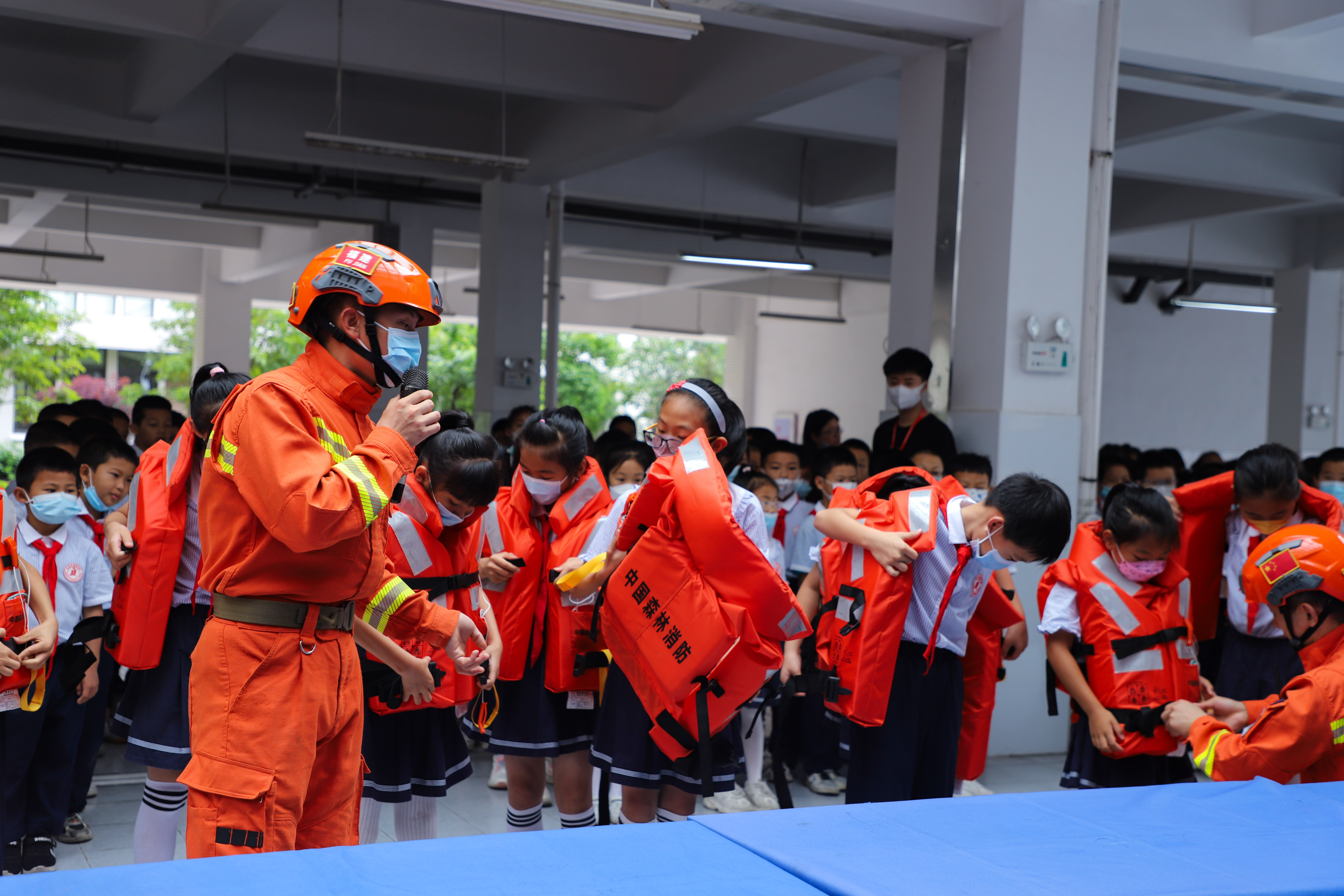 现场交流时,面对消防员提出“逃生出口标志怎么看?”“如何正确拨打报警电话?”等消防安全问题,学生们踊跃回答,现场气氛活跃。在互动环节中,消防员一边讲解消防安全知识,一边邀请学生们参与“学穿救生衣、速打逃生节”等互动体验,通过寓教于乐的方式进一步加强学生们汛期防险避险能力。