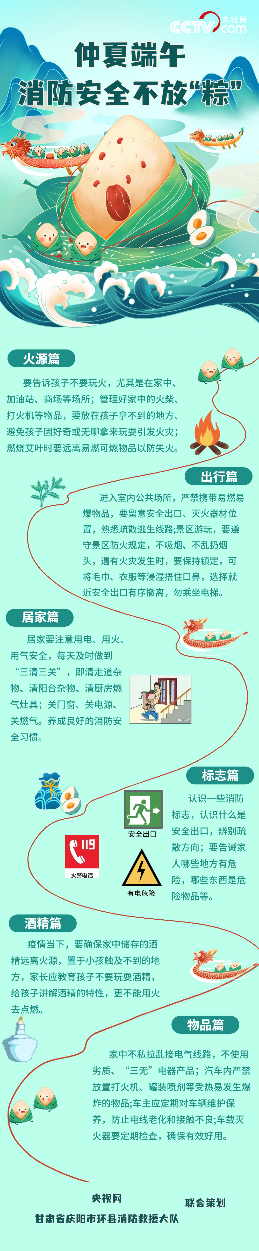 央视网消息(记者 赵晋 报道员 孙伟嘉):仲夏端午将至,民俗活动居多,气温逐渐升高,发生火灾的风险也随之增加,做好防疫的同时,也要注意消防安全。假日期间注意用电、用火、用气安全,厨房用火不离人,及时清理阳台、楼道杂物等,居安思危,杜绝隐患。请收好这份端午假期消防安全小提示。
