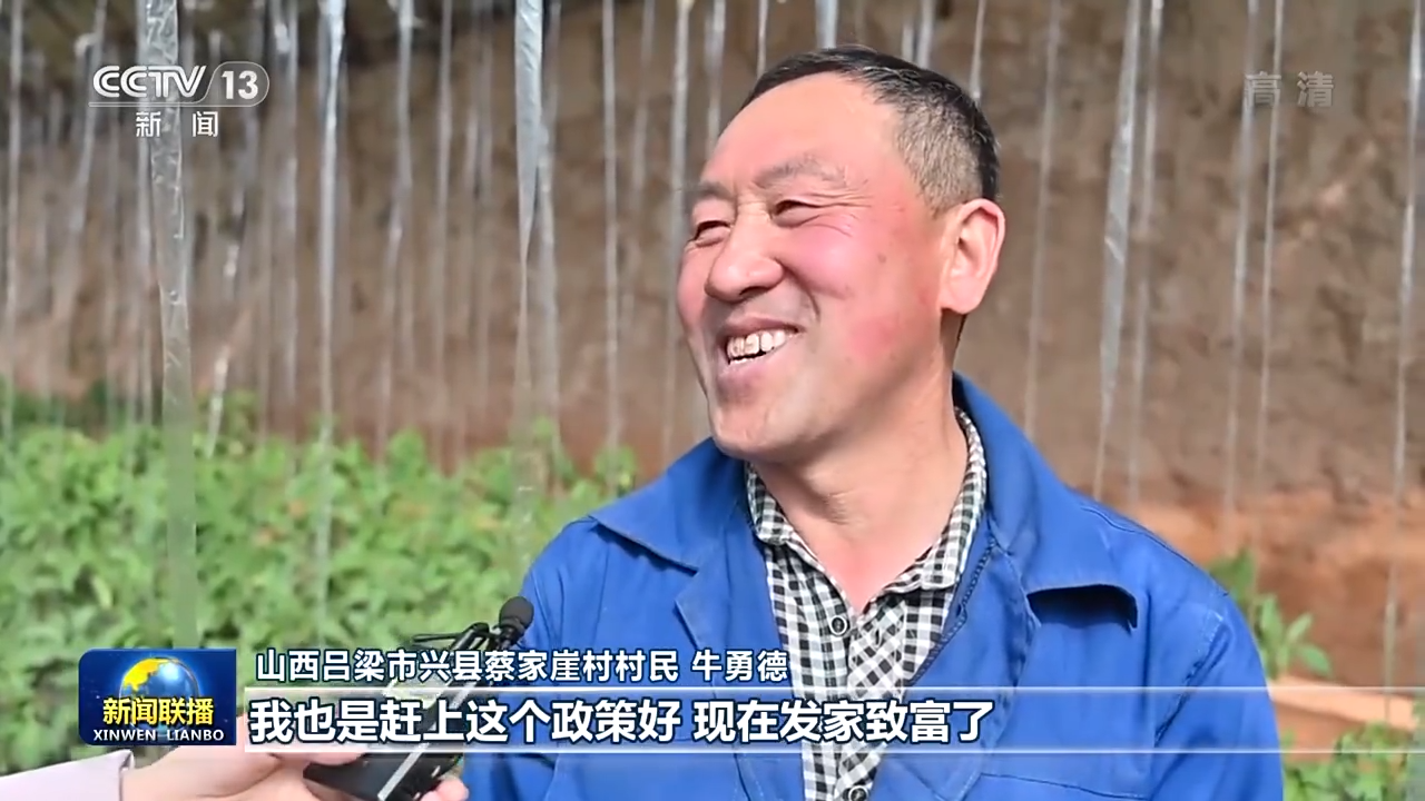 山西吕梁市兴县蔡家崖村村民 牛勇德:今年这一棚苗子又是长势挺好,今年又是收成也不错,我也是赶上这个政策好,现在发家致富了。