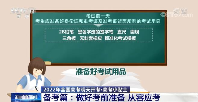 央视网消息:那么在高考前,考生需要做好哪些准备,还有哪些注意事项,我们也进行了梳理。
