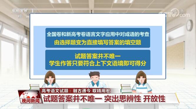 除了备受关注的作文试题,今年语文试卷还增强了试题的开放性,进一步降低死记硬背和“机械刷题”的得分收益。比如,全国卷和新高考卷语言文字应用中对成语的考查,由选择题变为直接填写答案的填空题。试题答案并不唯一,学生作答只要符合上下文语境即可得分。