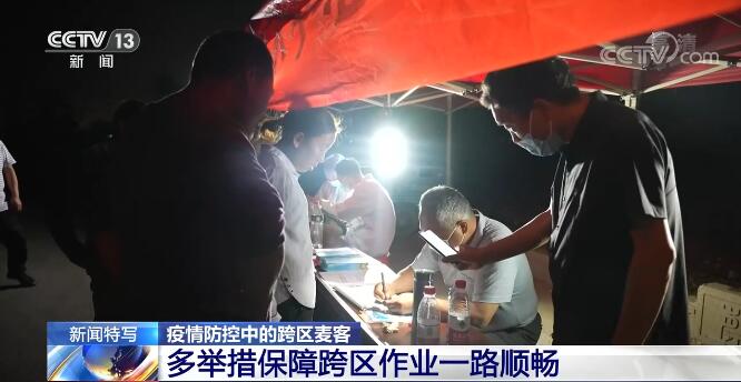 晚上10时多,来自黑龙江佳木斯的机手孔德宝和老乡田佰良在完成信阳息县的收割后,拉着两台收割机赶到了上蔡县,要按一位用户发的定位去往麦收地点。驻马店上蔡县是河南的种粮大县,小麦种植面积146万亩。6月1日前后,上蔡县的小麦进入大面积的收割时段,3000多台跨区作业的收割机云集上蔡参加抢收,持有跨区作业证的孔德宝和老乡田佰良在农机转运“绿色通道”服务站点接受免费落地核酸检测。