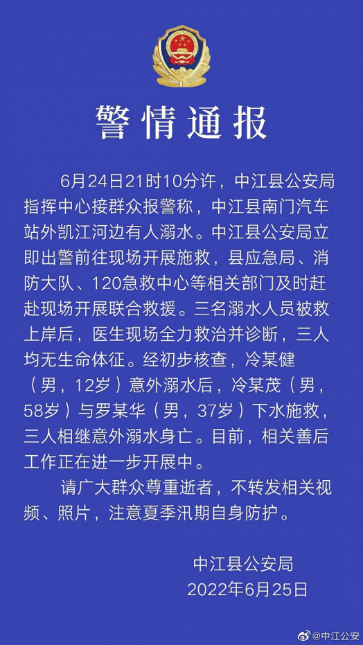 ·四川中江警方通报:一男孩溺水后两男子下水施救,三人均意外溺亡。
