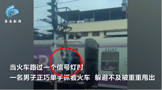 ·印度一男子单手扒火车撞上信号灯被重摔在地,在火车驶离后被当地人发现送往医院。