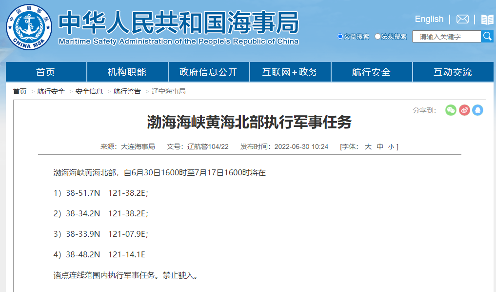 大连海事局发布航行警告:渤海海峡黄海北部将执行军事任务