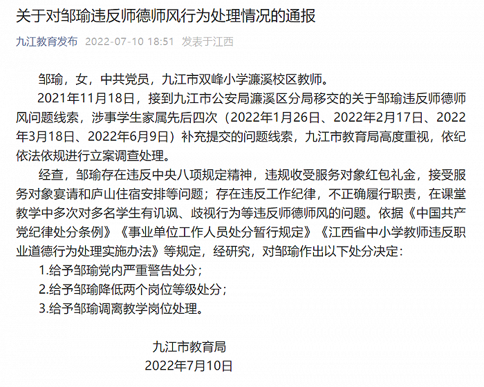 2021年11月18日,接到九江市公安局濂溪区分局移交的关于邹瑜违反师德师风问题线索,涉事学生家属先后四次(2022年1月26日、2022年2月17日、2022年3月18日、2022年6月9日)补充提交的问题线索,九江市教育局高度重视,依纪依法依规进行立案调查处理。