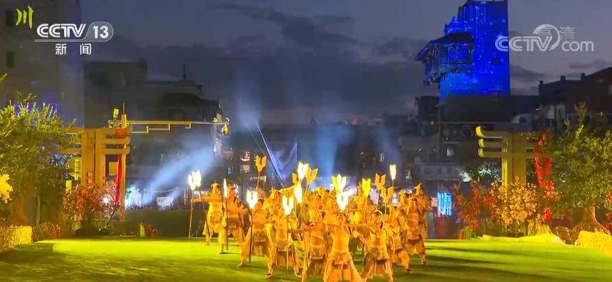 夜幕降临,华灯初上,北川巴拿恰商业街热闹非凡。一场沉浸式民俗文化演艺体验剧《走北川》精彩上演。