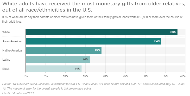 这项最新民意调查发现,38%的白人成年人表示,他们从父母或年长的亲戚那里得到了至少1万美元的礼物或贷款。只有14%的黑人成年人收到了类似的礼物或贷款。拉美裔的这一比例为16%,美国原住民为19%。