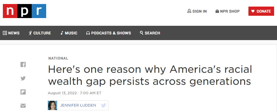 布朗表示,这种差异反映了几代人的隔离和种族主义,尤其是在住房政策方面。种族限制性契约禁止白人将自己的房屋出售或出租给非洲裔美国人或其他少数族裔。而联邦住房管理局的政策支持这种限制。“所以,如果你的祖父母买了一套由联邦住房管理局承保的房子,那是因为他们是白人。”