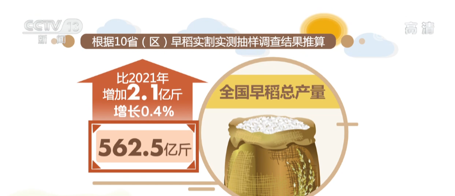 根据10省(区)早稻实割实测抽样调查结果推算,全国早稻总产量562.5亿斤,比2021年增加2.1亿斤,增长0.4%。