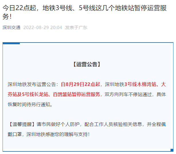 央视网消息:“深圳交通”微信公众号消息,8月29日,深圳地铁发布运营公告:自8月29日22点起,深圳地铁3号线木棉湾站、大芬站及5号线长龙站、百鸽笼站暂停运营服务,双方向列车不停站通过,具体恢复时间待另行通知。