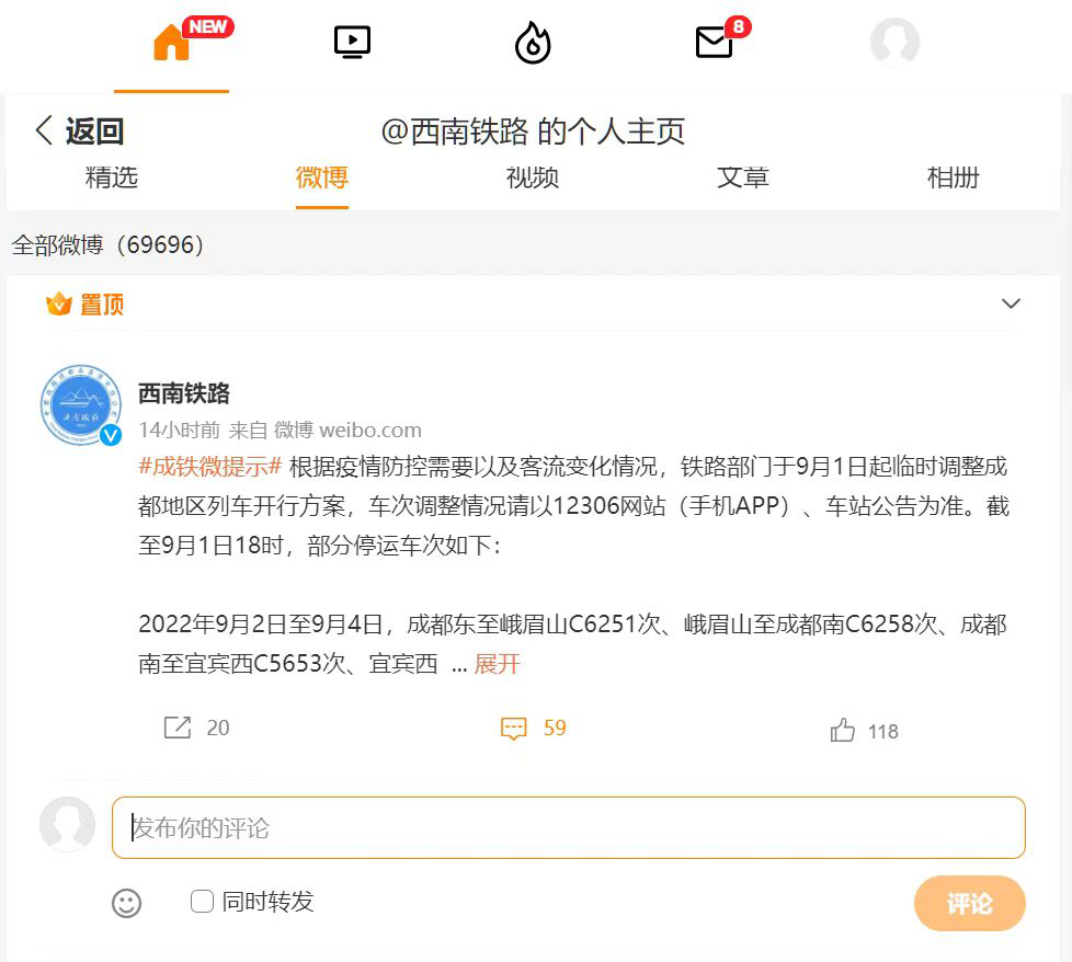 正在阅读:成都铁路局:9月2日起停运45车次列车 30日内免费退票