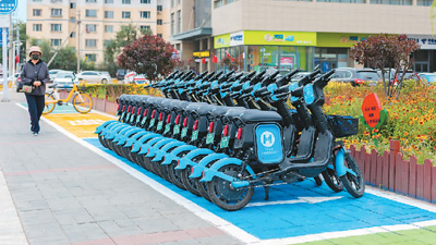在内蒙古呼和浩特市,共享单车(助力车)专属停车位亮相街头。当地设置了黄色、绿色、蓝色等多种颜色的停车位,为不同品牌的共享单车(助力车)提供停放场所。