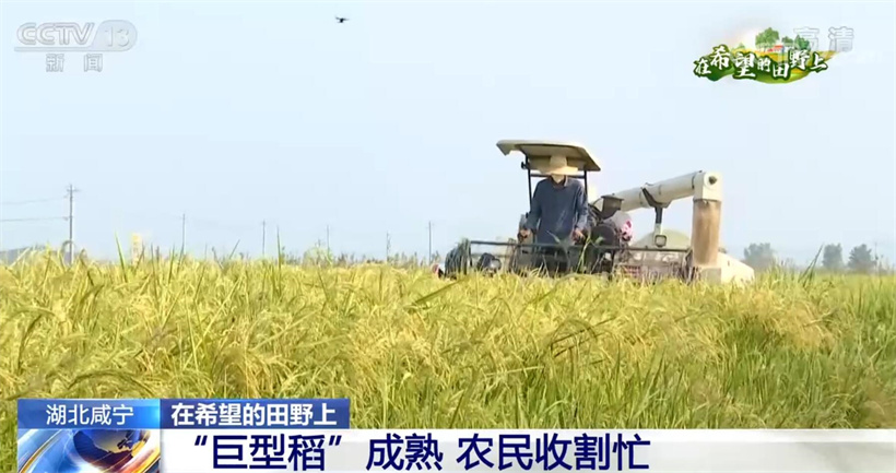 这里是湖北省咸宁市嘉鱼县两湖村,金色的稻田里,收割机正对成熟的“巨型稻”进行收割。据了解,“巨型稻”植株比常规稻高,从试种情况来看,植株高度在1.8米—2.2米之间。“巨型稻”具有高产、抗倒伏、抗病虫害以及耐旱的特点,稻田里还能养鱼、养虾、养鸭等,提高土地综合利用效率,增加农民收入。今年,嘉鱼县引进“巨型稻”品种试种,经过130多天的精心管理,“巨型稻”试种成功。目前,两湖村的“巨型稻”已收获3000多亩,从测产情况看,平均亩产可以达到850公斤。