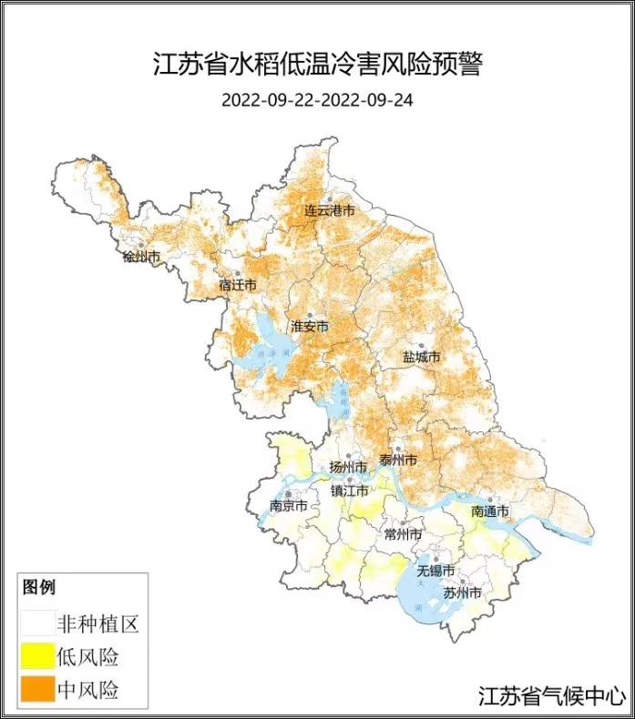 根据未来最低气温和持续天数,结合水稻灌浆期低温冷害指标,综合预判9月22-24日苏中和苏北地区为水稻低温冷害中风险区,约占水稻总种植面积的85.6%;苏南地区为水稻低温冷害低风险区,约占水稻总种植面积的14.4%。