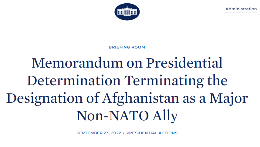 “我特此终止阿富汗作为美国‘非北约主要盟国’(的地位),”拜登在这份声明中称。