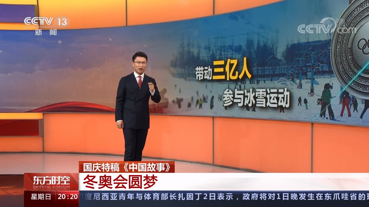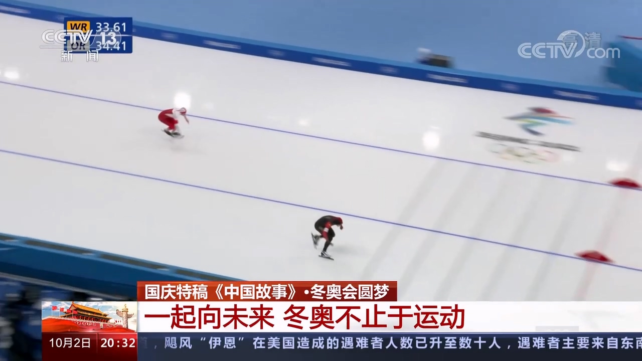 站上首钢三号高炉的国际奥委会主席巴赫曾感叹:“谈到可持续发展,你只需要在这里看看。”我们再来看一组数字:在北京冬奥会、冬残奥会使用的39个场馆中,10个利用既有场馆遗产、4个利用土地遗产;所有竞赛场馆100%使用绿色电力。冬奥遗产也正在联通区域协同发展,加速推进京津冀一体化。冰天雪地也是金山银山。这正是今天中国的发展理念——创新、协调、绿色、开放、共享。这是我们“一起向未来”的通衢大道。北京冬奥圆了冰雪运动员的梦,圆了三亿人参与冰雪运动的梦,圆了更多中国人过上美好生活的梦。这就是北京冬奥会场上场下的圆梦故事。《东方时空》国庆特稿《中国故事》,明天继续。