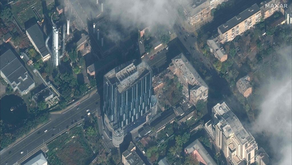 当地时间2022年10月12日,乌克兰基辅,卫星图像显示Tets-3发电站设施对面的三星总部受损的建筑。人民视觉 图