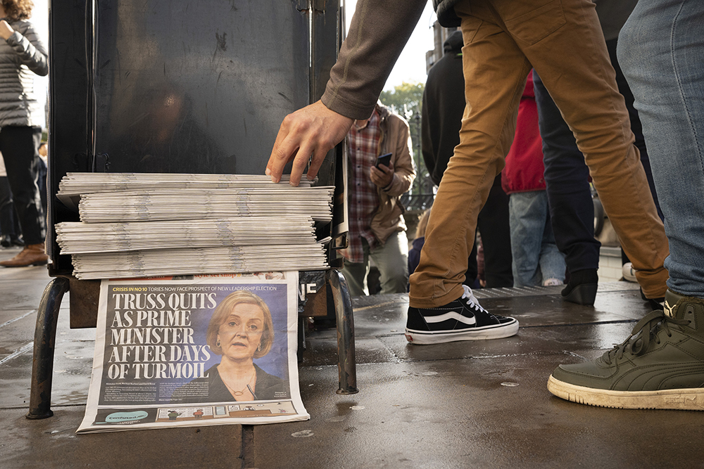 当地时间2022年10月20日,英国伦敦,当地报纸报道了特拉斯离职的消息。视觉中国 图