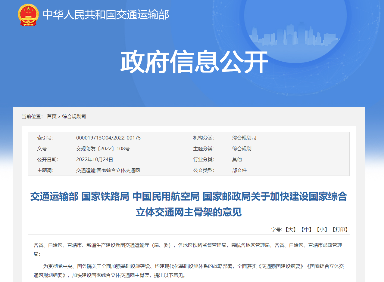 日前,交通运输部、国家铁路局、中国民用航空局、国家邮政局发布了《关于加快建设国家综合立体交通网主骨架的意见》(以下简称《意见》)。