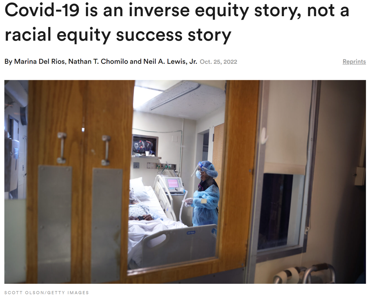 据美国医疗新闻网站STAT报道,正如麦克阿瑟基金会研究员詹妮弗·里奇森(Jennifer Richeson)2020年在《大西洋月刊》(The Atlantic)上指出的那样,美国人喜欢延续种族进步的叙事,不管这种叙事是否与现实相符。《纽约时报》最近的一篇文章称,新冠肺炎死亡率的变化是美国克服种族不平等的一个值得称赞的例子。该报资深作家大卫·莱昂哈特(David Leonhardt)表示,死亡率上的种族差距“消失”了。他还称:“这种病毒不再对黑人和西班牙裔美国人造成不成比例的伤害。”